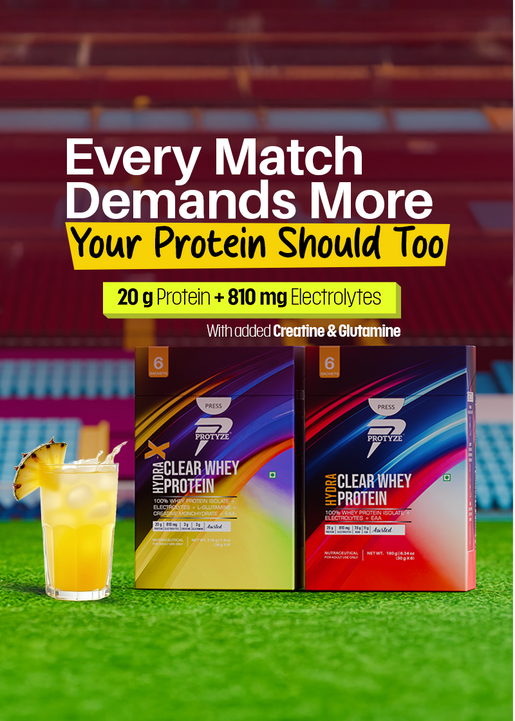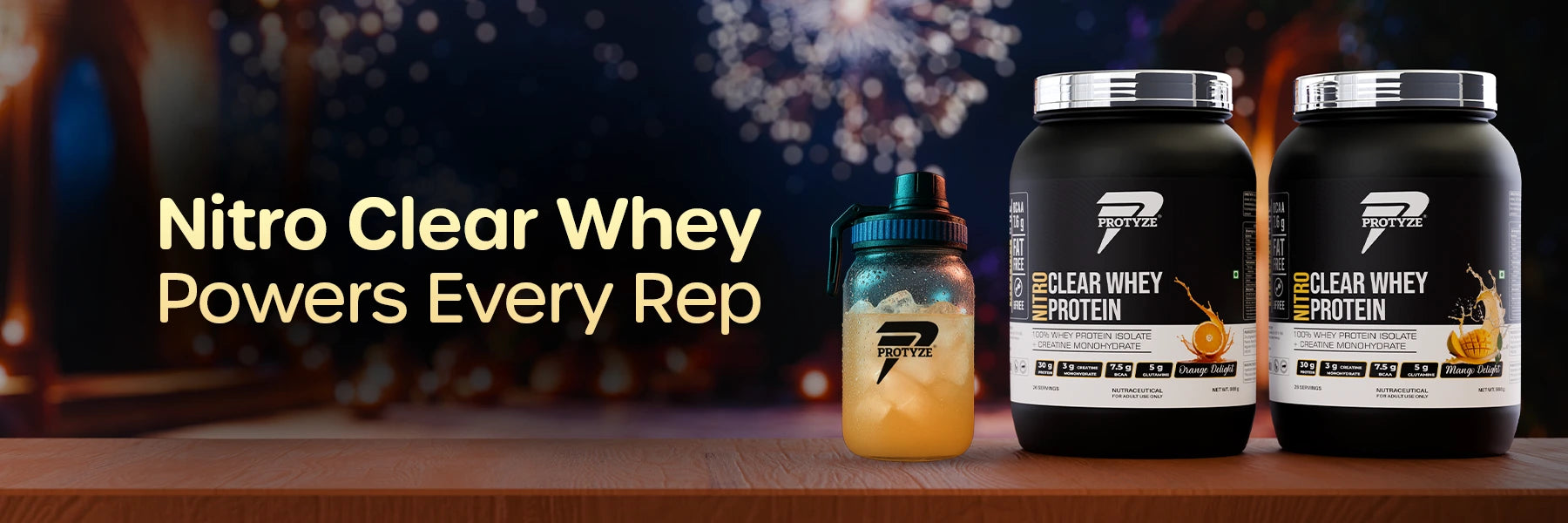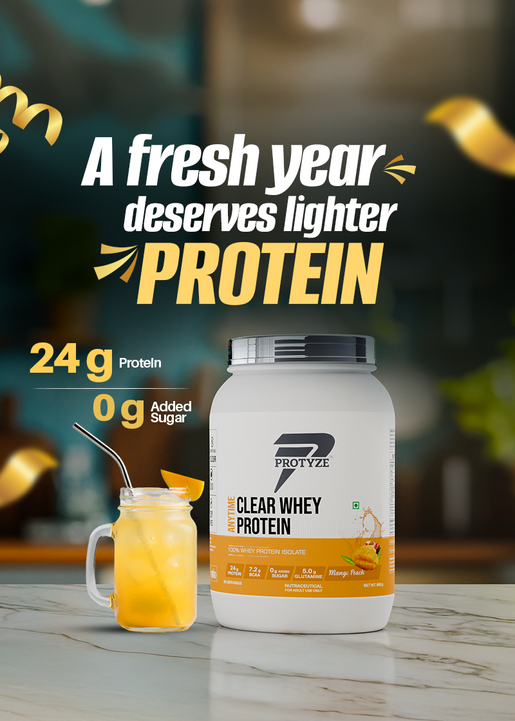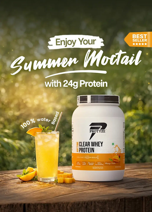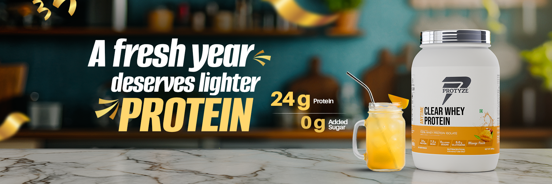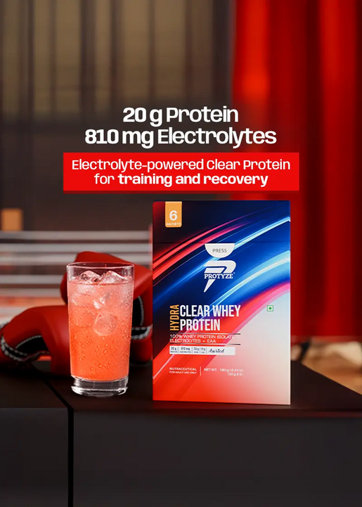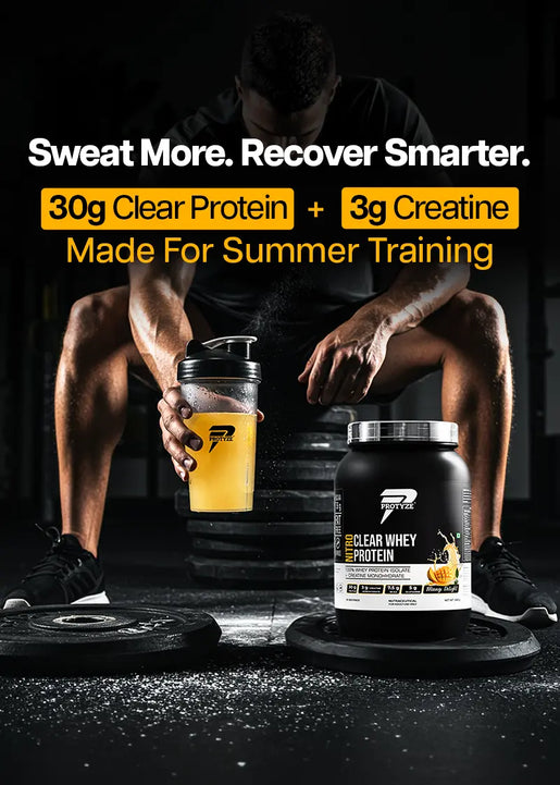 Upgrade your milky protein shakes with clear whey protein by Protyze — a new era of clean, clear, and effective whey protein nutrition. From best clear whey protein isolate to advanced blends with probiotics, creatine, electrolytes, and glutamine, our clear protein products are crafted to support strength, recovery, gut metabolism and hydration without the heaviness of traditional protein shakes. Whether you're working out or simply staying active, Protyze clear whey offers a range of light, fruit-flavoured best clear whey protein that are easy to digest and big on results. Make the switch to smarter, faster, and better whey protein — Made in India using a patented process, trusted by 26,000's of fitness enthusiasts.