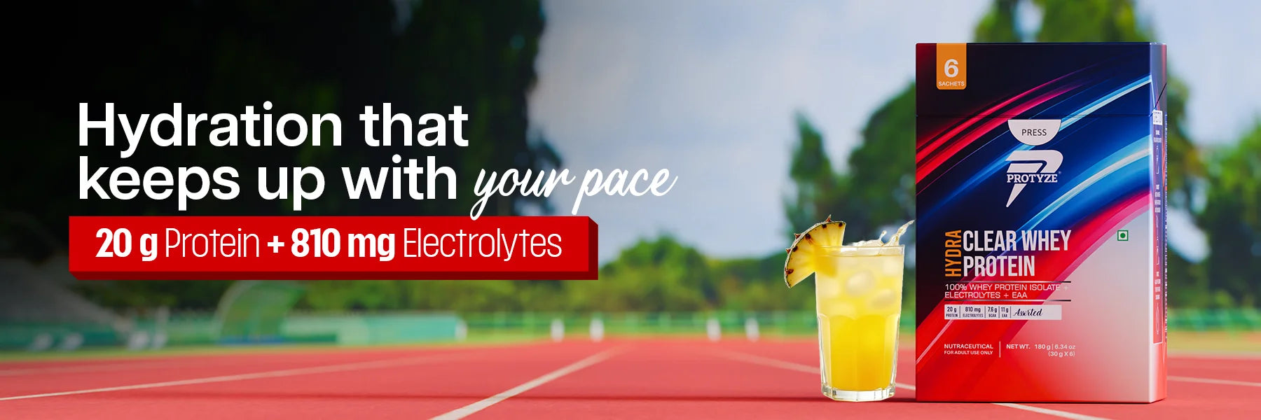 If you’re looking for the best electrolyte drink in India that also supports muscle recovery, endurance, and performance, Protyze Hydra Clear Whey Protein delivers the perfect balance of hydration + protein in one refreshing drink.