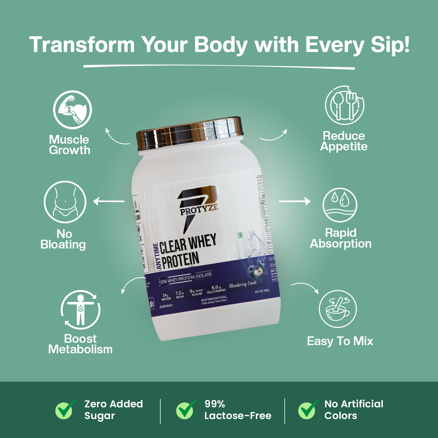 Protyze Clear Whey Isolate, free from fillers like maltodextrin or gums, is water-based, ensuring effortless blending and smooth shakes. Maximize absorption and performance with every sip. Embrace a clean, pure source of nutrition, crafted for efficacy, supporting your fitness journey without sacrificing taste or quality.