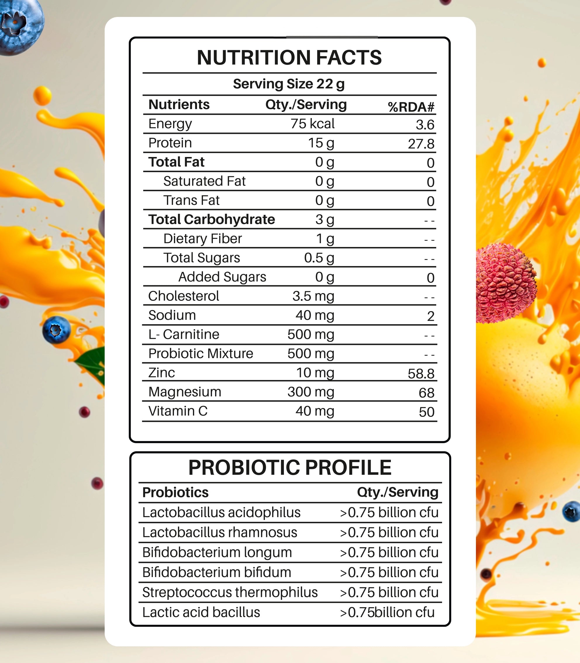 Whey Protein Isolate, L-Carnitine Tartrate, Probiotic Mixture, Dietary Fibre, Acidity Regulator (INS 330), Micro Nutrients, Sweetener (INS 955), Fruit and Vegetable Extract Colour, Anti-Caking Agent (INS 551).